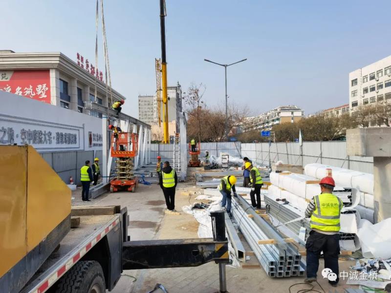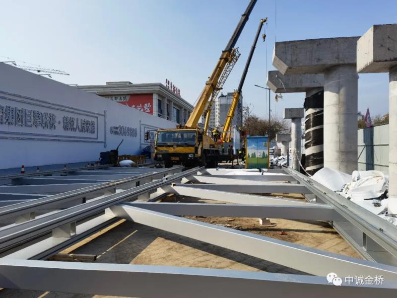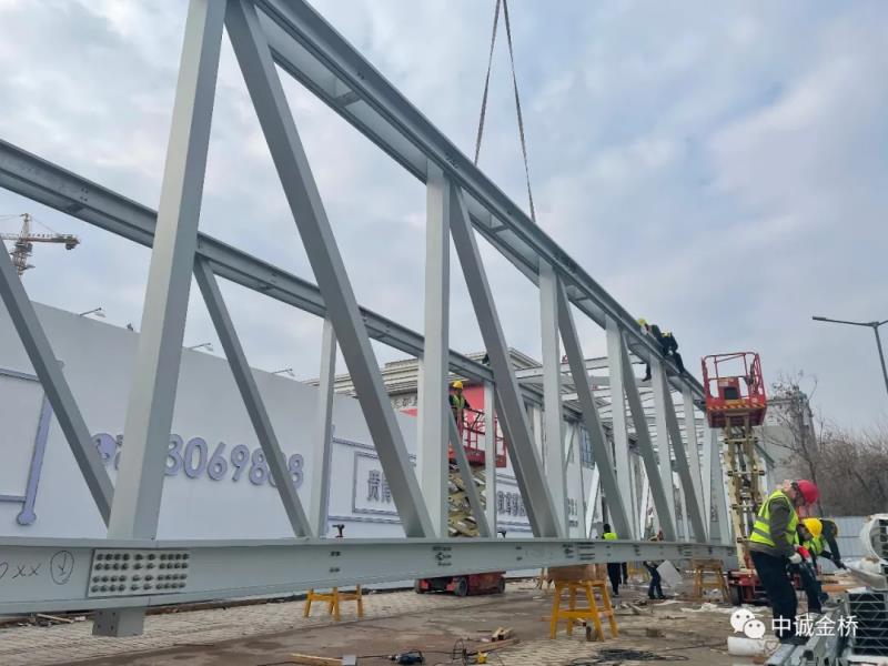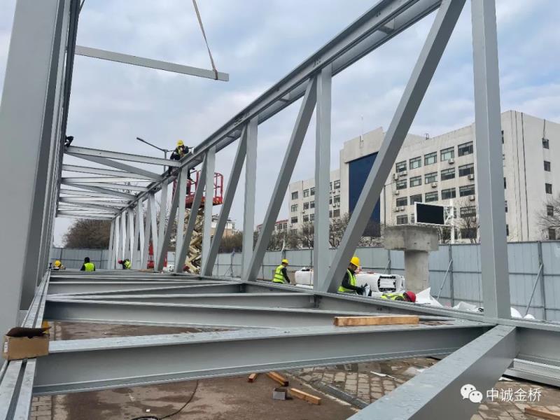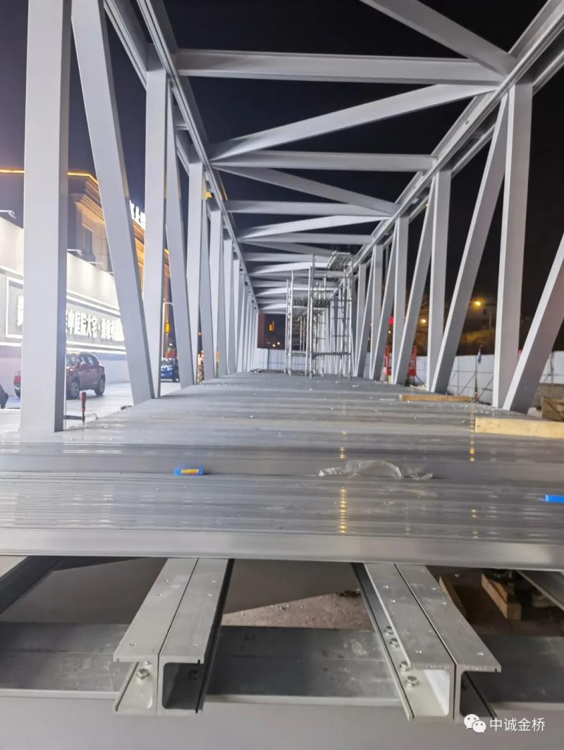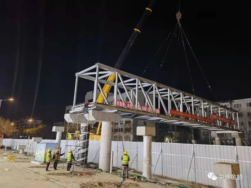 由中誠金橋工程有限公司承建的山東省濰坊市第一座鋁合金人行天橋“中新雙語南天橋”即將面世,主橋已于2021年12月3日凌晨2時(shí)45分完成了吊裝。